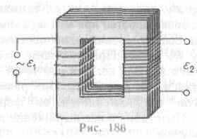 Принцип действия трансформаторов, применяемых для повышения или понижения напряжения переменного тока, основан на явлении взаимной индукции. Впервые трансформаторы были сконструированы и введены в практику русским электротехником П. Н. Яблочковым (1847—1894) и русским физиком И. Ф. Усагиным (1855—1919). Принципиальная схема трансформатора показана на рис. 186.