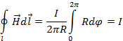 Полученное соотношение представляет закон Ампера в интегральной форме. Он получен для прямолинейного провода, но может быть распространен и на общий случай: циркуляция магнитного по контуру, охватывающему ток равна значению тока в контуре