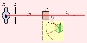 Концепция фотонов, предложенная А. Эйнштейном в 1905 г. для объяснения фотоэффекта, получила экспериментальное подтверждение в опытах американского физика А. Комптона (1922 г.). Комптон исследовал упругое рассеяние коротковолнового рентгеновского излучения на свободных (или слабо связанных с атомами) электронах вещества. Открытый им эффект увеличения длины волны рассеянного излучения, названный впоследствии эффектом Комптона, не укладывается в рамки волновой теории, согласно которой длина волны излучения не должна изменяться при рассеянии. Согласно волновой теории, электрон под действием периодического поля световой волны совершает вынужденные колебания на частоте волны и поэтому излучает рассеянные волны той же частоты. Схема Комптона представлена на рис. 8.2.1. Монохроматическое рентгеновское излучение с длиной волны λ0, исходящее из рентгеновской трубки R, проходит через свинцовые диафрагмы и в виде узкого пучка направляется на рассеивающее вещество-мишень P (графит, алюминий). Излучение, рассеянное под некоторым углом θ, анализируется с помощью спектрографа рентгеновских лучей S, в котором роль дифракционной решетки играет кристалл K, закрепленный на поворотном столике. Опыт показал, что в рассеянном излучении наблюдается увеличение длины волны Δλ, зависящее от угла рассеяния θ: