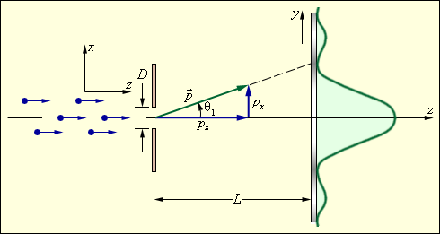 Это формула волновой теории. С корпускулярной точки зрения можно считать, что при пролете через щель электрон приобретает дополнительный импульс в перпендикулярном направлении. Пренебрегая 15 % электронов, которые попадают на фотопластинку за пределами центрального максимума, можно считать, что максимальное значение py поперечного импульса равно
