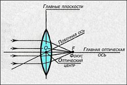 Главной оптической осью линзы (См. Рис.2) считается ось, проходящая через центры кривизны её поверхностей. В тонкой линзе точки пересечения главной оптической оси с обеими поверхностями линзы сливаются в одну точку О.(Т.к. очень большие радиусы кривизны приближаются к плоскостям, то сферические поверхности теоретически сливаються в одну плоскость). Эта точка называется оптическим центром линзы. Тонкая линза имеет одну главную плоскость, которая общая для двух сферических поверхностей и проходит через центр призмы и перпендикулярна к главной оптической оси. Все прямые, проходящие через оптический центр линзы, называются побочными оптическими осями линзы. Важным является то, что все лучи, идущие через оптический центр линзы, не преломляются. Поток монохроматических параллельных лучей или пучков лучей с осями их узких конусов, нормалльных к сферической границе раздела (к главной плоскости, см.Рис.2), называют парксиальными (приосевыми) пучками. При этом, пройдя через неё сходятся в главном фокусе линзы F. Главные фокусы линзы лежат на главной оптической оси линзы. Точки, расположенные на главной оптической оси линзы с двух сторон оптического центра на равных расстояниях F2. (См. Рис.4), называются главными фокусами линзы. Плоскости, проходящие через главные фокусы F2 линзы и перпендикулярные к её главной оптической оси, называются фокальными плоскостями линзы. Непараксиальные пучки не дают стигматических оптических изображений и после преломления становятся не гомоцентрическими.