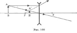 При любом расстоянии от предмета до рассеивающей линзы она дает мнимое, прямое, уменьшенное изображение (рис. 100).