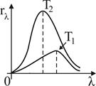 | | На рисунке показана кривая зависимости спектральной плотности энергетической светимости абсолютно черного тела от длины волны при Т=6000 К. Если температуру тела уменьшить в 2 раза, то энергетическая светимость абсолютно черного тела уменьшится...