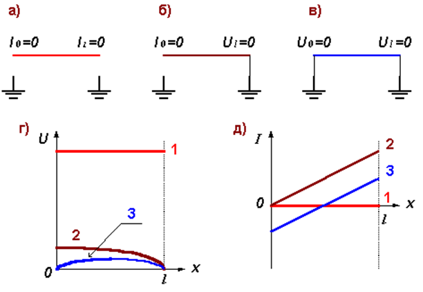 Рис. 7 1) изолированный от земли смежный провод, в начале и в конце провода ток в нем равен нулю (рис. 7а); 2) провод в начале изолирован, в конце заземлен на заземлитель с очень малым сопротивлением; ток в начале провода равен нулю, напряжение относительно земли в конце провода равно нулю (рис. 7б); 3) провод заземлен в начале и в конце, напряжения в начале и в конце относительно земли нулевые (рис. 7в). На рис. 7г изображена зависимость наводимого на смежный провод напряжения по отношению к земле от расстояния от начала смежного провода для всех трех случаев. Поскольку индуктивное сопротивление провода мало по сравнению с емкостным сопротивлением системы провод-земля, то случай 3 (так же, как и случай 2) на самом деле будет характеризоваться гораздо меньшим напряжением, чем это показано на рис. 7г в предположении линейных осей координат. Рис. 7д отображает распределение тока по смежному проводу, причем нулевой ток случая 1 следует из того, что емкостный делитель по рис. 5 определяет одинаковость потенциалов разных точек вдоль провода; положительным изображен ток, протекающий слева направо, а случай 3 проиллюстрирован на рис. 8.
