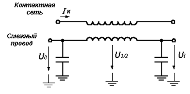Рис. 10 При изолированном от земли проводе схема замещения рис. 10 составлена двумя одинаковыми ячейками с половинными источниками ЭДС величиной Контактная сеть и смежный провод связаны друг с другом через магнитное поле и вполне могут рассматриваться как обмотки трансформатора без сердечника, с количеством витков обмоток по одному. При заземлении одного из зажимов катушки напряжение на втором зажиме по отношению к земле равно ЭДС в катушке. При заземлении средней точки катушки на зажимах будут два половинных противофазных напряжения, и такая же картина будет в случае подключения двух конденсаторов на выводы катушки без заземления средней точки. В последнем случае все равно, будет ли что-либо присоединено между средним выводом катушки и землей. Смежный провод отличается от витка трансформатора только более слабой магнитной связью с первичным витком - контактной сетью.