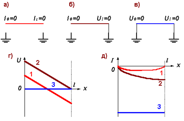 Рис. 12 Собственно, картина распределения напряжения вдоль провода уже ясна; если дополнить ее соображением о линейной связи наводимой ЭДС с длиной смежного провода (поскольку площадь этого витка и магнитный поток внутри него растет прямо пропорционально длине провода), то распределение напряжения провод-земля вдоль смежного провода по рис. 12г понятно. Последний случай 3 (рис. 17в) соответствует нулевому напряжению относительно земли вдоль всего провода, если не учитывать сопротивление заземлений и активное сопротивление провода. Можно сослаться здесь на правило Ленца, согласно которому наведенные токи препятствуют изменению магнитного поля; можно снова взглянуть на рис. 11, представив ситуацию короткого замыкания витка. При коротком замыкании возникающий в витке ток пытается полностью скомпенсировать магнитное поле в стержне магнитопровода, и только жесткая связь через магнитное поле с первичной катушкой не позволяет этому свершиться, приводя к резкому росту тока вплоть до ограничений его индуктивностью рассеяния и активным сопротивлением витка. Для провода в зоне влияния контактной сети ток растет только до компенсации вызывающего ЭДС магнитного поля, а ток контактной сети вовсе не станет компенсировать этот рост из-за слабой обратной связи по магнитному полю. Хотя на рис. 12г изображен график действующего значения напряжения, которое должно быть всегда положительным, для обозначения переворота фазы напряжения на нем изображена часть линии в отрицательной полуплоскости. То же самое сделано и на рис. 12д для величины тока в смежном проводе, графики которого располагаются ниже оси абсцисс в связи с положительным направлением тока слева направо на рис. 12а, 12б, 12в и знаком минус в формуле для ЭДС по закону электромагнитной индукции. При заземлении провода с двух сторон ток одинаков по всей длине провода (линия 3), а в остальных случаях, как это следует из более корректного рассмотрения, ток зависит от координаты по квадратичному закону. Расчетным вариантом для магнитного влияния является случай заземления провода на конце, при котором напряжение в начале равно полной ЭДС в проводе, взятой с противоположным знаком: