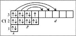 | У атома фтора только один неспаренный электрон на 2 р -подуровне. Возбуждение атома с целью перевода электронов с 2 р -подуровня на более высокий уровень с n = 3 невозможно, т. к. энергии химической реакции недостаточно для такого процесса. В связи с этим фтор в своих соединениях всегда одновалентен. У атома хлора энергетический электронный уровень с n = 3 состоит из трех подуровней: s, p и d. Один неспаренный электрон невозбужденного атома хлора располагается на 3 p -подуровне, и в таком состоянии хлор, как и фтор, одновалентен (хлороводород НСl, хлорид натрия NaCl, хлорид-ион Cl–, оксид хлора Cl2О, хлорноватистая кислота HСlO, соли-гипохлориты, гипохлорит-ион). Электроны с 3 s - и 3 p -подуровней атома хлора могут при достаточной энергии возбуждения переходить, распариваясь, на 3 d -подуровень, что показано стрелками на рис. 4. В результате последовательно образуется: три неспаренных электрона и соответственно проявляется трехвалентное состояние (хлористая кислота НСlO2, соли-хлориты, хлорит-ион), пять неспаренных электронов и проявляется пятивалентное состояние (хлорноватая кислота НСlO3, соли-хлораты, хлорат-ион), семь неспаренных электронов и проявляется семивалентное состояние хлора (оксид хлора Cl2O7, хлорная кислота НСlO4, соли-перхлораты, перхлорат-ион).