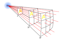 Светимость — отношение светового потока, исходящего от рассматриваемого малого участка поверхности, к площади этого участка. Светимость измеряется в Лм/м². 1 Лм/м² — это светимость светового потока в 1 Лм, испускаемого с 1 м². Освещённость — физическая величина, численно равная световому потоку, падающему на единицу поверхности. Единицей измерения освещённости в системе СИ служит люкс (1 люкс = 1 люмену на квадратный метр), в СГС — фот (один фот равен 10 000 люксов). В отличие от освещённости, выражение количества света, отражённого поверхностью, называется яркостью. Освещённость прямо пропорциональна силе света источника света. При удалении его от освещаемой поверхности её освещённость уменьшается обратно пропорционально квадрату расстояния (Закон обратных квадратов). В физике, закон обратных квадратов — это закон, утверждающий, что значение некоторой физической величины в данной точке пространства обратно пропорционально квадрату расстояния от источника поля, которое характеризует эта физическая величина. Закон обратных квадратов в общем случае применим, когда линии действия некоторой силы, или энергия или другая сохраняющая полное значение величина расходится (распространяется) в радиальном направлении от источника. По мере того, как площадь сферы (которая определяется по формуле 4πr2) растёт пропорционально квадрату расстояния от источника (радиуса сферы), и как испущенное излучение удаляется всё дальше от источника, это излучение должно проходить через поверхность, площадь которой растёт пропорционально квадрату расстояния от источника. Следовательно, интенсивность излучения, проходящего через одну и ту же площадь, обратно пропорционально квадрату расстояния от источника.