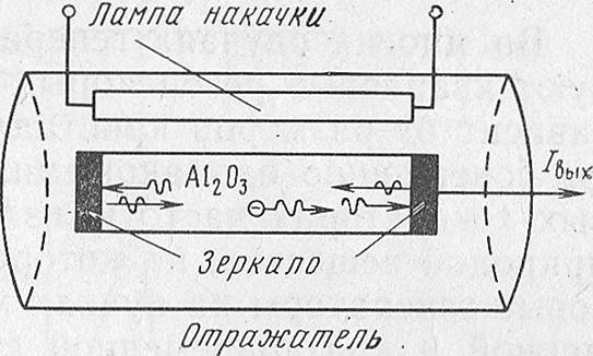 Рис 1. Рубиновый лазер: схема расположения энергетических уровней Для этого кристалл рубина освещается очень короткими, Но очень интенсивными вспышками высокомощной лампы накачки. Рубин поглощает сине-зеленую часть спектра излучения лампы накачки. В результате этого электроны с уровня 1 переходят на уровень 3, приобретая энергию. Так как уровень 3 короткоживущий, его избыточная населенность долго не удерживается. Электроны сразу переходят в основном на уровень 2 и накапливаются на нём, пока не будут выполнены условия самовозбуждения лазере, Затем с уровня 2 электроны вынужденно или спонтанно (самоп-роизвольно) переходят на уровень 1, излучая фотоны с частой γ21, соответствующей красному свету. Для самовозбуждения необходима положительная обратная связь.