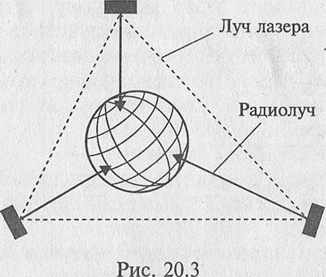 В оптическую часть передатчика входят: лазер, модулятор света и оптические линзы, фокусирующие и ориентирующие луч света в требуемом направлении. В радиотехническую часть передатчика входят: СВЧ усилитель, согласующее устройство, связывающее вход модулятора с выходом усилителя, и кодер, служащий для кодирования передаваемого сообщения. Преимущества оптического передатчика состоят: в возможности передачи с высокой скоростью как цифровой (109 бит/с и выше), так и аналоговой (десятки гигагерц) информации исключительно большого объема; высокой когерентности и острой направленности излучения, что позволяет существенно снизить мощность передатчика; высокой помехозащищенности, особенно при использовании волоконных световодов. Рассмотрим более подробно работу оптической системы связи в космическом пространстве. Ее применение для передачи информации на большие расстояния в околоземном пространстве из-за сильного влияния атмосферы на луч света может приводить к столь сильному затуханию в канале связи, что прием сигнала может стать невозможным. Зато весьма эффективно применение оптических систем связи в космическом пространстве, где затухание и расходимость луча света незначительны. В такой глобальной системе связь между спутниками вне земной атмосферы осуществляется с помощью оптической лазерной системы, а передача информации на Землю — в радиодиапазоне. Структура такой комбинированной оптико-радиоэлектронной системы приведена на рис. 20.3.