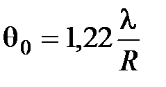 Интенсивность дифракционной картины определяется квадратом этой функции, т.е. в центре картины имеется светлое круглое пятно, окруженное темными и светлыми кольцами. Максимумы интенсивности быстро убывают. Радиусы колец определяются из корней функции Бесселя J1 (r)=0. Угловой размер центрального светлого пятна, наблюдаемого из центра круглого отверстия, равен: