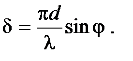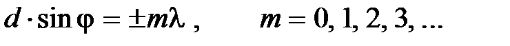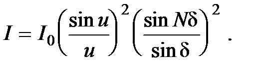 Множитель (sinu/u)2 характеризует распределение интенсивности в результате дифракции плоской волны на каждой щели и является огибающей всей дифракционной картины, а множитель (sinNd/sind)2 учитывает интерференцию между волнами, исходящими от всех щелей. Множитель I0 определяет интенсивность света, излучаемого в направлении j = 0, которая зависит от потока энергии, падающего на решетку света. Величина dsinj равна разности хода между волнами, испускаемыми двумя эквивалентными точками соседних щелей. Условие главных максимумов для дифракционной решетки определяется формулой