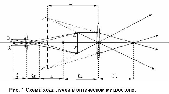 Для значного збільшення малих об'єктів застосовується мікроскоп - оптична система, що складається в найпростішому випадку з короткофокусної збирає лінзи (об'єктива) О1 з фокусною відстанню fоб і телефото збирає лінзи (окуляра) О2 з фокусною відстанню Fок (рис.1). Лінзи будемо розглядати тільки тонкі, товщина яких пренебрежимо мала в порівнянні з радіусами кривизни лінзи. Нагадаємо, що фокусом лінзи називається точка, в якій після заломлення збираються всі промені, що падають на лінзу паралельно головній оптичній осі. Головна оптична вісь це пряма, що проходить через центри кривизни поверхонь Предмет АВ поміщається від об'єктива на відстані, трохи більшому fоб. Дійсне, збільшене і перевернуте зображення А'В' виявляється від окуляра на відстані, трохи меншому Fок - воно розглядається у окуляр, як в лупу. У результаті виходить уявне, збільшене і перевернуте (щодо предмета) зображення А'' В'', що знаходиться від окуляра на відстані L, званому відстанню ясного зору (для нормального ока L ~ 25 см). Відстань l між "внутрішніми" фокусами об'єктива й окуляра називається оптичною довжиною тубуса мікроскопа (зазвичай l = 16 см). Загальне збільшення мікроскопа N дорівнює добутку збільшень об'єктива і окуляра: