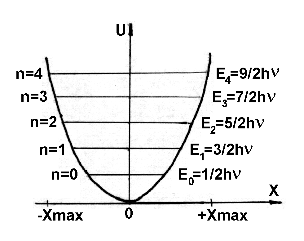 где k = mω20 – коэффициент квазиупругой силы, ω0 – собственная циклическая частота ЛГО, ω0 = 2πν, ν – частота колебаний ЛГО, m – масса колеблющейся системы (частицы). Амплитуда колебаний ЛГО определяется его полной энергией Е. В точках с координатами ±xmax полная энергия Е равна потенциальной энергии. Поэтому с классической точки зрения частица не может выйти за пределы области (-xmax, +xmax). Таким образом, классический осциллятор находится в “потенциальной яме” c координатами -xmax ≤ х ≤ + xmax, ограниченной параболой на рис. 170.