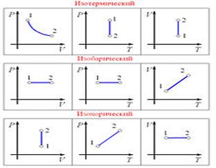 4.11. Изопроцессы — термодинамические процессы, во время которых количество вещества и ещё одна из физических величин — параметров состояния: давление, объём или температура — остаются неизменными. Так, неизменному давлению соответствует изобарный процесс, объёму — изохорный, температуре — изотермический, энтропии — изоэнтропийный (например, обратимый адиабатический процесс). Линии, изображающие данные процессы на какой-либо термодинамической диаграмме, называются изобара, изохора, изотерма и адиабата соответственно. Изобарный процесс