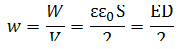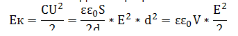Поскольку напряжение на конденсаторе может быть рассчитано из соотношения: U = E*d, где E - напряженность поля между обкладками конденсатора, d - расстояние между пластинами конденсатора, то энергия заряженного конденсатора равна: