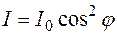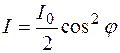 Пучок естественного света проходит через два идеальных поляризатора. Интенсивность естественного света равна I0, угол между плоскостями пропускания поляризаторов равен φ. Согласно закону Малюса интенсивность света после второго поляризатора равна... 1)