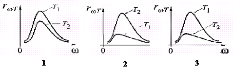 Распределение энергии в спектре излучения абсолютно черного тела в зависимости от частоты излучения для температур T1 и Т2 (T1 > Т2) верно представлено на рисунке... 3