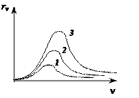 На рисунке представлены графики зависимости спектральной плотности энергетической светимости абсолютно черного тела от частоты при различных температурах. Наименьшей температуре соответствует график... 1) 2 2) 3 +3) 1