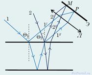 Разность хода лучей 1 и 2 в отраженном свете можно выразить следующим образом (считаем что показатель преломления среды n меньше показателя преломления стекла: