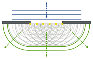 Принцип Гюйгенса-Френеля: каждый элемент волнового фронта можно рассматривать, как центр вторичного возмущения, порождающего вторичные сферические волны, а результирующее световое поле в каждой точке пространства будет определяться интерференцией этих волн.