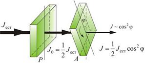 Если поляризованный свет пропустить через поляризатор (в этом случае он называется анализатором), интенсивность света, вышедшего из анализатора, равна произведению интенсивности света, падающего на анализатор, и квадрату косинуса угла между осями поляризатора и анализатора: Ia=Ipcos2α (закон Малюса).