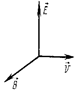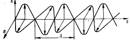 Векторы E иB в электромагнитной волне перпендикулярны друг другу и перпендикулярны направлению распространения волны. Электромагнитная волна является поперечной. Если вращать буравчик с правой нарезкой от вектора E к векторуB, то поступательное перемещение буравчика будет совпадать с вектором скорости волны υ. Электромагнитная волна поперечна. Направление скорости электромагнитной волны совпадает с направлением движения правого винта при повороте ручки буравчика вектора