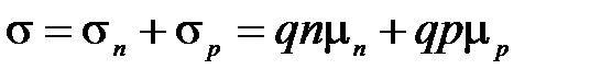 Поскольку в полупроводнике два типа подвижных носителей, удельная проводимость складывается из двух составляющих – электронной и дырочной проводимостей,