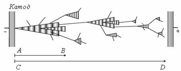 Энергию ионизации При заданных значениях давления газа и температуры ударная ионизация начинается при определенном значении напряженности поля, поскольку Наибольшее число актов ионизации приходится на электроны, так как длина свободного пробега их почти на порядок выше, чем у ионов, и согласно выражению (3.3) они набирают под воздействием поля большую энергию. Кроме того электроны по сравнению с ионами обладают в 100 - 1000 раз большей подвижностью. Поэтому за одинаковый промежуток времени они пройдут в 100-1000 раз большее расстояние и, соответственно, произведут большее число актов ионизации. Следует учитывать также, что, если положительный ион, разогнанный полем, испытывает соударение с периферическим электроном нейтральной частицы, то условия для ионизации электрона оказываются неблагоприятными, так как при большом различии массы энергия, отдаваемая электрону при упругом ударе, мала. При явлениях разряда положительные ионы высвобождают электроны из металла, бомбардируя поверхность катода. В ряде случаев электрон, разогнанный полем, может не ионизировать молекулу, а привести ее в «возбужденное состояние» – вызвать изменение в движении электронов, связанных с молекулой. В следующий момент эта «возбужденная» молекула отдает свою избыточную энергию в форме излучения – испускает фотон. Некоторые из фотонов имеют энергию, превышающую энергию ионизации молекул. Такие фотоны рождаются за счет ударного возбуждения электронов, находящихся на внутренних оболочках атомов. При поглощении фотона, обладающего большой энергией, другой молекулой возможна ее ионизация. Внутренняя фотонная ионизация газа благодаря большой скорости распространения излучения приводит к особо быстрому развитию в разрядном промежутке каналов с повышенной проводимостью газа. На рис. 3.2 представлена схема, поясняющая, почему рост электропроводящего канала (стримера) происходит быстрее, чем продвижение электронной лавины. На этом рисунке лавины условно показаны в виде заштрихованных конусов, а линиями изображены пути фотонов. Внутри каждого конуса газ ионизируется ударами электронов. Выбитые электроны, разгоняемые полем, ионизируют встречаемые ими частицы газа. Так лавинообразно нарастает число электронов, движущихся к аноду, и число положительных ионов, направляющихся к катоду. Начала линий исходят из атомов, которые были возбуждены ударом электрона и вслед за тем испустили фотон.