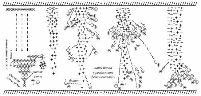 Рис. 3.3. Схема возникновения и развития положительного стримера (развитие стадий разряда показано слева направо) Из рис. 3.3 видно, что многие электроны вовлекаются в область наибольшей концентрации положительных ионов – в головную часть положительного стримера. Насыщение электронами пространства, заполненного положительными зарядами, превращает эту область в проводящую газоразрядную плазму. Под влиянием ударов положительных частиц на катоде возникает катодное пятно, излучающее электроны. В результате указанных процессов и возникает пробой газа. Чем больше напряжение, приложенное к газовому промежутку, тем быстрее развивается пробой. Если длительность воздействия напряжения очень мала, то пробивное напряжение повышается. Это повышение обычно характеризуют коэффициентом импульса:
