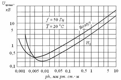 Рис. 3.5. Зависимость пробивного напряжения от произведения давления газа При увеличении давления свыше Date: 2015-05-18; view: 789; Нарушение авторских прав |