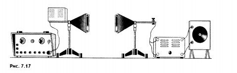 Современные радиотехнические устройства позволяют провести очень наглядные опыты по наблюдению свойств электромагнитных волн. При этом лучше всего пользоваться волнами сантиметрового диапазона. Эти волны излучаются специальным генератором сверхвысокой частоты (СВЧ). Электрические колебания генератора модулируют звуковой частотой. Принятый сигнал последетектирования подается на громкоговоритель. Электромагнитные волны излучаются рупорной антенной в направлении оси рупора. Приемная антенна в виде такого же рупора улавливает волны, которые распространяются вдоль его оси. Общий вид установки изображен на рисунке 7.17. Поглощение электромагнитных волн. Располагают рупоры друг против друга и, добившись хорошей слышимости звука в громкоговорителе, помещают между рупорами различные диэлектрические тела. При этом замечают уменьшение громкости. Отражение электромагнитных волн. Если диэлектрик заменить металлической пластиной, то звук перестанет быть слышимым.