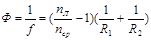 где f — фокусное расстояние линзы; nЛ — абсолютный показатель преломления вещества линзы; nср — абсолютный показатель преломления окружающей среды (одинаковой с обеих сторон линзы). В приведенной формуле радиусы выпуклых поверхностей (R1 и R2) берутся со знаком плюс, вогнутых — со знаком минус. • Оптическая сила двух тонких сложенных вплотную линз Ф=Ф1+Ф2. • Формула тонкой линзы