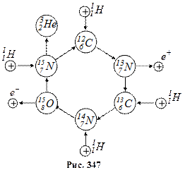 В результаті цього циклу 4 протони перетворюються в ядро гелію і виділяється енергія, яка дорівнює 26,7 МеВ. Ядра ж вуглецю, кількість яких залишається незмінною, беруть участь у реакції в ролі каталізатора. Схема протікання вуглецево-азотного циклу наведена на рис. 347.