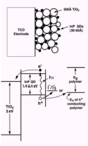 Поглощенный квантовой точкой фотон приводит к образованию фотовозбужденных электрона и дырки, которые могут переходить в электрон-и дырочно-транспортные слои, как схематично показано на рисунке. В качестве таких транспортных слоев могут выступать проводящие полимеры n-и p-типов проводимости, в случае электрон транспортного слоя по аналогии с элементом Gratzel возможно использование пористых слоев оксидов металлов. Подобные солнечные батареи имеют немаловажное достоинство, как возможность содания гибких элементов при нанесении слоев на полимерные подложки, а также относительную дешевизну и простоту изготовления. Публикации о возможном применении квантовых точек для солнечных батарей можно найти в работа P.Alivisatos и A.Nozic Date: 2015-05-18; view: 612; Нарушение авторских прав |