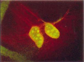 Создание флуоресцентных меток на основе квантовых точек является весьма перспективным. Можно выделить следующие преимущества квантовых точек перед органическими красителями: возможность контроля длины волны люминесценции, высокий коэффициент экстинкции, растворимость в широком диапазоне растворителей, стабильность люминесценции к действию окружающей среду, высокая фотостабильность. Также можно отметить возможность химической (или более того биологической) модификации поверхности квантовых точек, позволяющей осуществить селективное связывание с биологическими объектами. На правом рисунке показано окрашивание элементов клетки при помощи водорастворимых квантовых точек, люминесцирующих в видимом диапазоне. На левом рисунке представлен пример использования неразрушающего метода оптической томографии. Фотография полученна в ближнем ИК-диапазоне при использовании квантовых точек с люминесценцией в диапазоне 800-900 нм (окно прозрачности крови теплокровных), введенных в мышь.