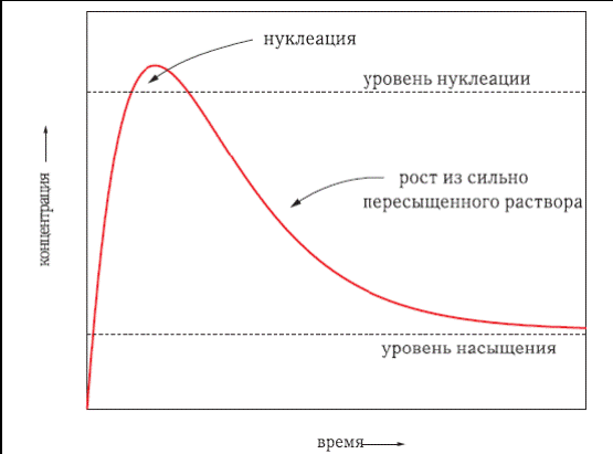 Изменение концентрации конденсирующегося вещества на этапах нуклеации и роста из сильно пересыщенного раствора. Чем больше разность Сп-Сн и чем меньше Сн, тем быстрее образуются зародыши, тем больше возникает центров кристаллизации и тем ближе по размеру оказываются коллоидные частицы к некоторому среднему значению. При образовании зародышей появляется новая поверхность раздела фаз. Этот процесс увеличивает свободную энергию системы пропорционально квадрату диаметра частиц. В то же время происходит снижение энергии системы за счет химического превращения, пропорциональное диаметру кристаллитовв степени 3.