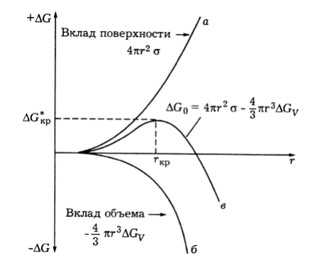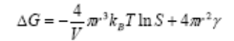 Максимальная свободная энергия равна энергии активации зародышеобразования. Для данного значения S все частицы с размером большим r* будут расти, а все частицы с размером меньше r* будут растворяться. Как видно из приведенного уравнения бóльшая степень пересыщения соответствует меньшему критическому размеру зародышей.