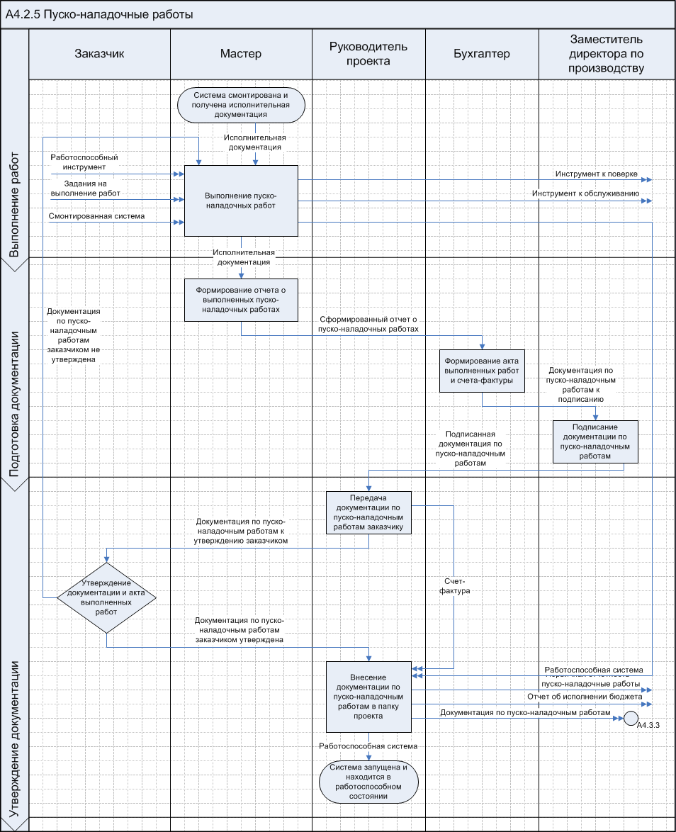 Достаточно распространенным инструментом, с помощью которого можно изображать технологические и информационные связи в процессах проекта в привязке к системе ответственности, являются межфункциональные схемы (Cross Functional Flowcharts). В программе «Business Studio» эти схемы разбиты на две нотации – «Процесс» (Basic Flowchart) и «Процедура» (Cross Functional Flowchart), которые позволяют задать причинно-следственные связи и временную последовательность выполнения действий процесса (см. рис. 3.21).