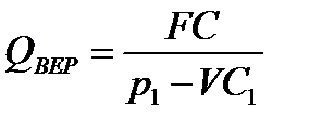 При определении этого показателя принимается, что издержки на производство продукции могут быть разделены на условно-постоянные (не изменяющиеся при изменении объема производства) издержки FC и условно-переменные, изменяющиеся прямо пропорционально объему производства, VC. Точка (уровень) безубыточности определяется по формуле: 1) в случае, если в рамках проекта производится одно наименование продукции и точку безубыточности нужно определить в единицах продукции: