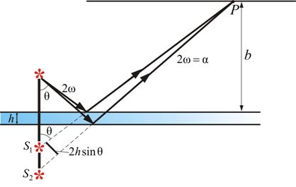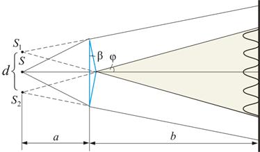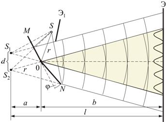 Зеркала Френеля Другой интерференционный опыт, аналогичный опыту Юнга, но в меньшей степени осложненный явлениями дифракции и более светосильный, был осуществлен О. Френелем в 1816 г. Две когерентные световые волны получаются в результате отражения от двух зеркал М и N, плоскости которых наклонены под небольшим углом φ друг к другу (рис. 8.4). Источником служит узкая ярко освещенная щель S, параллельная ребру между зеркалами. Отраженные от зеркал пучки падают на экран, и в той области, где они перекрываются (поле интерференции), возникает интерференционная картина. От прямого попадания лучей от источника S экран защищен ширмой . Для расчета освещенности J экрана можно считать, что интерферирующие волны испускаются вторичными источниками и , представляющими собой мнимые изображения щели S в зеркалах. Поэтому J будет определяться формулой двулучевой интерференции, в которой расстояние l от источников до экрана следует заменить на , где - расстояние от S до ребра зеркал, b - расстояние от ребра до экрана (см. рис 8.4.). Расстояние d между вторичными источниками равно: . Поэтому ширина интерференционной полосы на экране равна: . Бипризма Френеля В данном интерференционном опыте, также предложенном Френелем, для разделения исходной световой волны на две используют призму с углом при вершине, близким к 180°. Источником света служит ярко освещенная узкая щель S, параллельная преломляющему ребру бипризмы (рис. 8.5). Рис. 8.5 Можно считать, что здесь образуются два близких мнимых изображения S 1 и S 2 источника S, так как каждая половина бипризмы отклоняет лучи на небольшой угол . Билинза Бийе Аналогичное бипризме Френеля устройство, в котором роль когерентных источников играют действительные изображения ярко освещенной щели, получается, если собирающую линзу разрезать по диаметру и половинки немного раздвинуть (рис. 8.6). Рис. 8.6 Прорезь закрывается непрозрачным экраном А, а падающие на линзу лучи проходят через действительные изображения щели и и дальше перекрываются, образуя интерференционное поле. Расчет интерференционной картины от двух источников. Расчет интерференционной картины для двух источников можно провести используя две узкие параллельные щели, расположенные достаточно близко друг к другу. Щели S1 и S2 находятся на расстоянии d друг от друга и являются когерентными источниками света. Интерференция наблюдается в произвольной точке А экрана, параллельного обеим щелям и расположенного от них на расстоянии l, причем l>>d. Начало отсчета выбрано в точке О, симметричной относительно щелей. Интенсивность в любой точке А экрана, лежащей на расстоянии х от О, определяется оптической разностью хода (разностью оптических длин проходимых волнами путей). Из рисунка имеем: откуда или. Из условия l>>d следует, что поэтому. Подставив найденное значение в условия интерференционного максимума и минимума: и, получим, что максимумы интенсивности будут наблюдаться при, а минимумы — при. Расстояние между двумя соседними максимумами (или минимумами) называемое шириной интерференционной полосы равно:. не зависит от порядка интерференции (величины m) и является постоянной для. обратно пропорционально d, след. при большом расстоянии между источниками, например, , отдельные полосы становятся неразличимыми. Из двух предпоследних формул следует так же, что интерференц