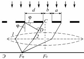Пусть луч 1 падает на линзу под углом φ (угол дифракции). Световая волна, идущая под этим углом от щели, создает в точке максимум интенсивности. Второй луч, идущий от соседней щели под этим же углом φ, придет в ту же точку. Оба эти луча придут в фазе и будут усиливать друг друга, если оптическая разность хода будет равна m λ: