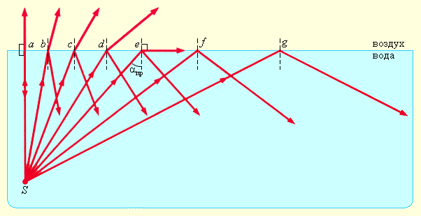 где n = n 1 > 1 – абсолютный показатель преломления первой среды. Для границы раздела стекло–воздух (n = 1,5) критический угол равен αпр = 42°, для границы вода–воздух (n = 1,33) αпр = 48,7°.