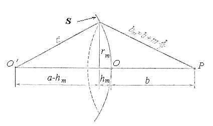 Приближённо, не принимая во внимание уменьшение интенсивности сферической волны с расстоянием, которое она проходит, в расчётах можно полагать, что величиной (5.9) определяется интенсивность волны, создаваемой каждой из зон Френеля, близкой к первой. Это является следствием равенства площадей зон Френеля, соответствующих различным значениям m. Действительно, принимая во внимание (рис. 5.13), находим площадь сферического сегмента радиуса и высоты
