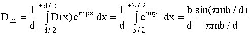 Рассмотрим более общий случай амплитудно-фазовой дифракционной решетки. Расчет параметров дифракционных решеток разного типа проводится в предположении, что период решетки значительно больше длины световой волны, что позволяет вычислять пропускаемость D(x) в приближении геометрической оптики. Начнем с плоской амплитудной решетки, состоящей из прозрачных щелей b и непрозрачных промежутков между ними ширины а. В приближении геометрической оптики пропускаемость D(x) равна единице на щели и нулю в промежутках между ними. Начало координат поместим в середине щели. Тогда коэффициент Фурье Dm представится выражением,