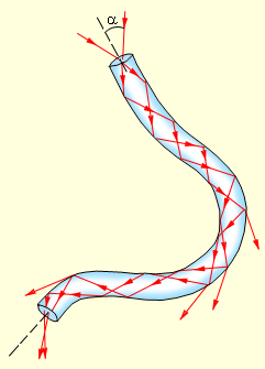 Если второй средой является воздух (n 2 ≈ 1), то формулу удобно переписать в виде где n = n 1 > 1 – абсолютный показатель преломления первой среды. Для границы раздела стекло–воздух (n = 1,5) критический угол равен αпр = 42°, для границы вода–воздух (n = 1,33) αпр = 48,7°. Явление полного внутреннего отражения находит применение во многих оптических устройствах. Наиболее интересным и практически важным применением является создание волоконных световодов, которые представляют собой тонкие (от нескольких микрометров до миллиметров) произвольно изогнутые нити из оптически прозрачного материала (стекло, кварц). Свет, попадающий на торец световода, может распространяться по нему на большие расстояния за счет полного внутреннего отражения от боковых поверхностей (рис 3.1.3). Научно-техническое направление, занимающееся разработкой и применением оптических световодов, называется волоконной оптикой.