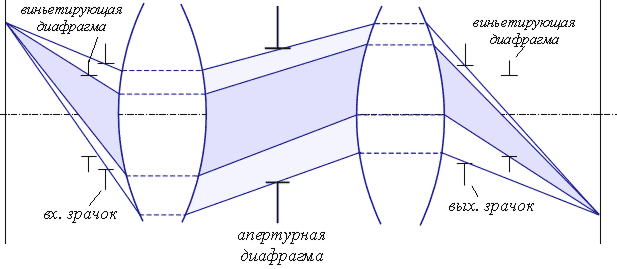 Если пучки лучей ограничиваются только апертурной диафрагмой, то они полностью заполняют зрачок, как показано на рис.7.2.3. Если внеосевые пучки дополнительно ограничиваются помимо апертурной другими диафрагмами, то зрачок заполняется не полностью (рис.7.2.4). Это дополнительное ограничение или срезание пучков называется виньетированием.