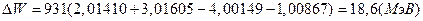Вероятность покинуть яму равна нулю; Энергия имеет минимально возможное значение. Ширине ямы соответствует целое число дебройлевских полуволн. 61. Частицы, входящие в состав ядра: Протоны и нейтроны (нуклоны); Нуклоны, входящие в состав ядер, обладают достаточно большой кинетической энергией, и, сталкиваясь между собой во время движения внутри ядра, они на очень короткие промежутки времени могут образовывать такие группы, которые по своим характеристикам похожи на отдельно существующие ядра такой же массы. Эти группы нуклонов называют кластерами. 62. Как изменится полная энергия системы, состоящей из одного свободного нейтрона и одного свободного протона, в результате их соединении в атомное ядро дейтерия? Уменьшится (т.к. для всех элементов масса покоя ядра меньше, чем сумма масс покоя составляющих его протонов и нейтронов, если последние находятся в свободном состоянии, следовательно меньше будет и энергия). 63. Сколько протонов Z и сколько нейтронов N в ядре изотопа кислорода Число протонов Z=8, число нейтронов N=A-Z, где А=17, следовательно N=17-8=9 Ответ: N=9 64. Сколько свободных нейтронов получится в реакции синтеза альфа-частицы из изотопов водорода с массовыми числами 2 и 3? Выделяется или поглощается энергия при этом? Составим ядерную реакцию Дано: mH2=2,01410 а.е.м, mH3=3,01605 а.е.м., mα=1,00149 а.е.м., mn=1,00867 а.е.м. Определим энергетический выход Ответ: Один нейтрон получится. Энергия выделяется. Date: 2015-05-18; view: 2349; Нарушение авторских прав |