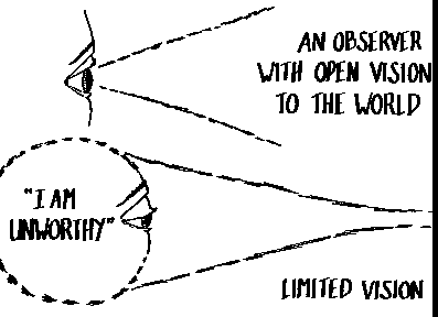 Следовательно, точка отсчета первоначального убеждения, “Жизнь тяжела”, становится базовой точкой отсчета. И она остается ей, пока наблюдатель не сможет понять, что во-первых он существует до своего убеждения, и что во-вторых он сам выбрал то убеждение, которое стало фильтром для входящих и исходящих восприятий и переживаний. Когда наблюдатель “усваивает” это на опыте, он может в настоящем перестать создавать этот фильтр или убеждение под названием “жизнь тяжела”. Классический пример, с которым мы все знакомы—чувство неполноценности или глупости (первая созданная решением часть(ица)). После мы пытаемся компенсировать это чувство, напряженно работая, чтобы доказать что мы не неполноценны (создание второй части(цы)). Заметьте, что сколько бы мы ни доказывали или пытались доказать нашу полноценность, мы постоянно чувствуем первое построение, неполноценность. Даже когда мы достигаем успеха, мы всегда сравниваем это чувство с нашим чувством неполноценности. По сути чувство неполноценности становится нашей точкой отсчета!!! “Вся наша реальность построена из таких постоянных сравнений. Наши чувства, которые описывают нам нашу реальность, все время делают эти сравнения. К сожалению, наши чувства, не имея абсолютной линии отсчета, должны вырабатывать свою собственную относительную линию отсчета. Ведь каждый раз, когда мы что-то воспринимаем, мы всегда воспринимаем только отличия, тепло это или холод, свет или темнота, тихо или шумно, всегда в сравнении с соответствующими количествами. У нас нет абсолютной меры ни для чего в том, что касается нашей повседневной реальности.” (Бентов, 1977:22) Клиентка, с которой я проводил терапию, подросток, чувствовала неполноценность по сравнению со своей старшей сестрой, которая в связи со своим возрастом, казалось, всегда делает все лучше и успешнее. Моя клиентка проигрывала каждый раз, когда пыталась достичь чего-то самостоятельно. Она начала постоянно сравнивать себя с “эталоном” своей старшей сестры и не могла быть сама собой. Она слилась со своей сестрой, которая стала её внутренним образцом. Каждый раз, когда она пробовала новый образ жизни, она автоматически сравнивала себя с сестрой и чувствовала старые эмоции неполноценности, неудачи и смятения. Ее убеждение “Я хочу быть полноценной” постоянно сравнивалось с её сестрой, которая была полноценной. Короче говоря, наблюдательница взяла картинку сестры и держала её в сознании вместе с чувствами неполноценности по сравнению с ней. Это первое построение. Затем она создала компенсирующую часть(ицу), чтобы доказать что она не неполноценна. Пытаясь отрицать первое построение, и сопротивляясь ему, мы создаем разделение на две части. Наблюдатель видит старые картинки, ассоциации, воспоминания, и не может выбрать новый шаг к более свободному сознанию, потому что делает выбор из предыдущих построений, а не из чистого открытого пространства. Часто мы удерживаем старые картинки для того, чтобы сопротивляться схожести с ними. Требуется энергия и усилия, чтобы постоянно удерживать картинку и сопротивляться схожести с ней, в то же время надеясь выработать другую реальность. Например, если личность решает: “Я не хочу быть такой как мама”, она должна все время удерживать в сознании картинку мамы (первое построение), чтобы знать чем не быть (второе по