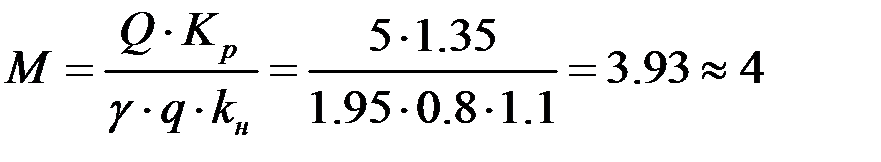 1. Определим число ковшей грунта, вмещаемого в кузов в соответствии с грузоподъемностью машины: где: М – число ковшей, Q –грузоподъемность транспортного средства. γ - плотность грунта (1.95 т/м3) Кр – коэффициент первоначального разрыхления Кр=1.35 Кн – коэффициент наполнения ковша Кн=1.1 (естественная влажность) q – емкость ковша